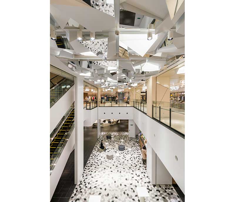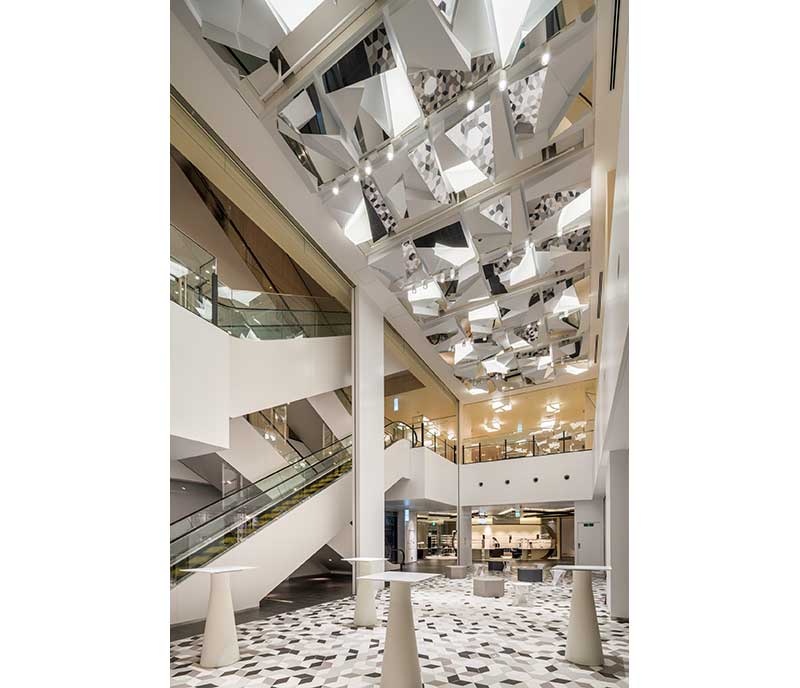 低層階と高層階を結ぶエスカレーターの乗り換えフロアに位置する、吹き抜けが象徴的なオープンスペースです。第二のメインフロアとして、幅広いモノ・コトを発信していきます。店舗通路に面しており目に留まりやすく周辺店舗からの誘引も見込まれます。吊りバトンによるバナー演出機能も備え、開放的な空間を生かした展示イベントや、商品発表・販売にもご利用いただけます。