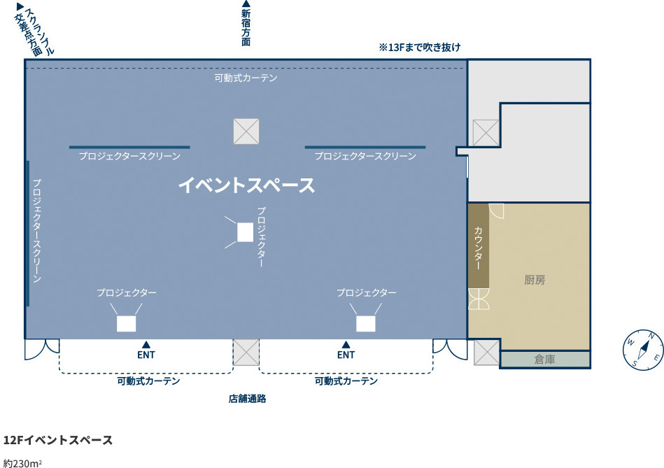 12Fのレストランフロアに位置する、開放的な吹き抜け空間です。本格的な厨房や、照明音響設備を完備しており、「食」をテーマにしたイベントに最高のパフォーマンスを発揮します。トークショーやエキシビションにも適しており、スペースの広さを活かして体験型イベントや展示を同時に行うことも可能です。北側の全面窓からは、渋谷を象徴するスクランブル交差点をのぞむことができ、情報発信をするロケーションとしての華やかさも併せ持っています。